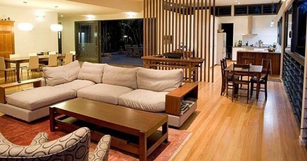 This open-plan living space incorporates a living room, dining room and kitchen as well as access to the alfresco entertaining space. When planning this home renovation, the owners were keen to reduce visible boundaries yet keep a clear definition between each of the rooms. This was achieved by the use of floor-to-ceiling open screens in natural timber to match the style of the home as well as reflect the natural tones from outside.