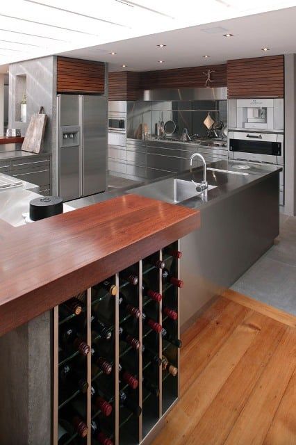 Stainless steel and polished concrete feature heavily throughout, and both contrast beautifully with the rich, warm tones of the teak benchtop. Storage solutions also abound in this kitchen, while there’s a welcoming modern charm that draws the family together.
