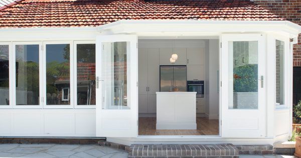To keep the rear of the home light and bright, the designer choose a warm white finish for the cabinets and benchtop which was highlighted by the bright turquoise tiled splashback. The rear wall was moved outwards and given a bay window shape to create a larger space with expanses of glass to the doors and walls which invite the natural light into the home and make indoor/outdoor entertaining so easy.